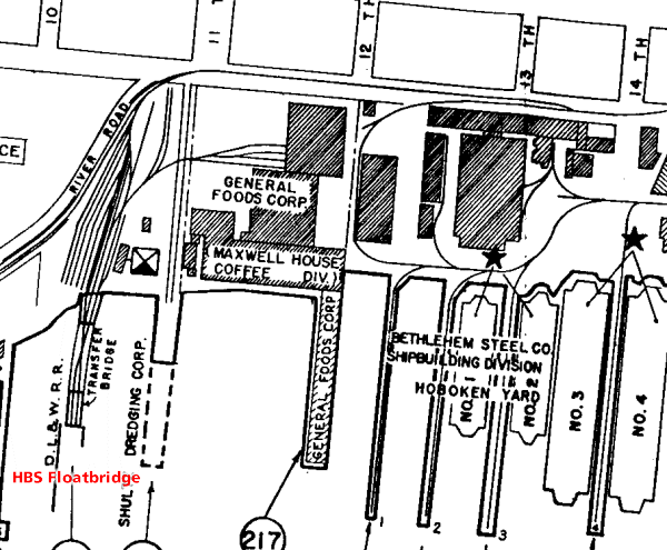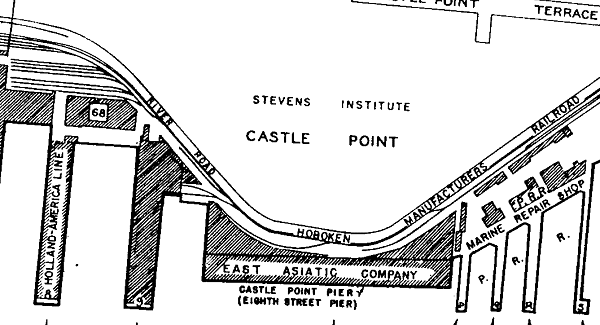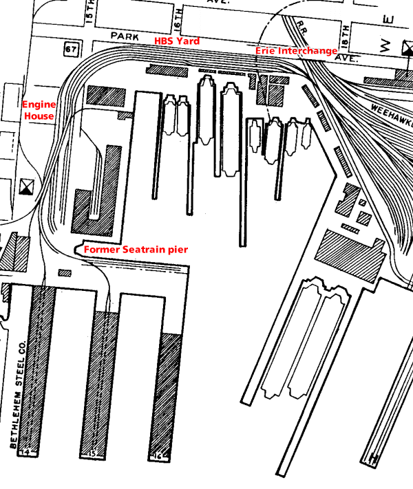 specially-designed ships with railroad cars for transshipment to Cuba and Texas. Seatrain started off in 1941 with a pier on the Hoboken Manufacturer's (See Map A), adjacent to the engine facility.