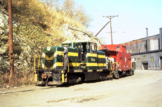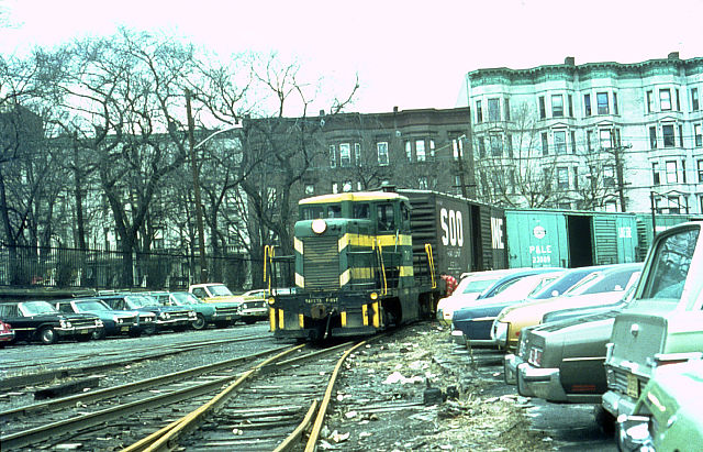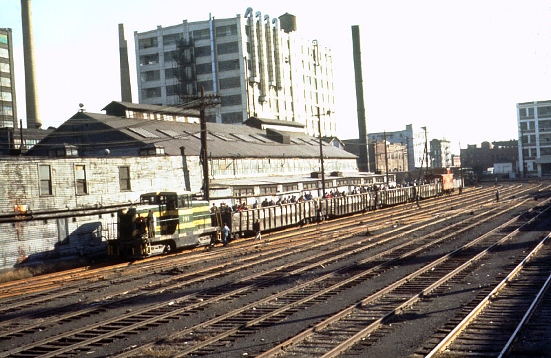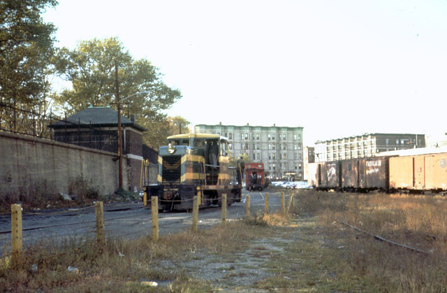 - Continuing down Hudson and onto River Street, this view shows HBS 700 and a train of gondolas and boxcars rounding the curve from Hudson Street. Maxwell House and its employee lot is at the right, and the far right track is the lead into the floatbridge yard. An interesting detail in this photo is the white lettering on 700. Most likely due to the original yellow lettering fading, this unit was retouched with white lettering around 1973. It is unknown if the 701 received this treatment, but based on photographic evidence, the 701 may not have been running that often at this point.