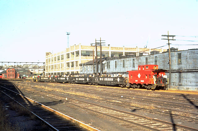 The building at left is Maxwell House Coffee. The road continuing straight beyond the flatcar is Hudson Street, and the flatcar