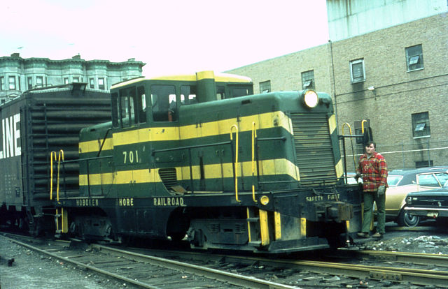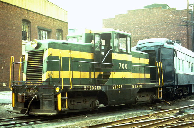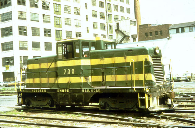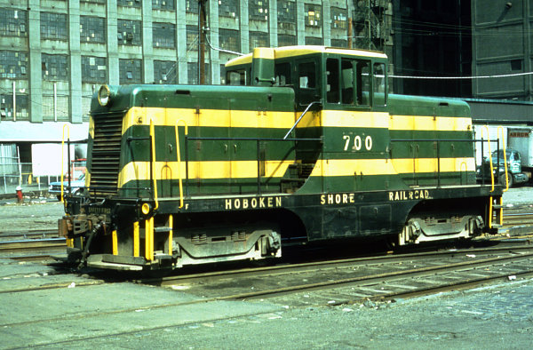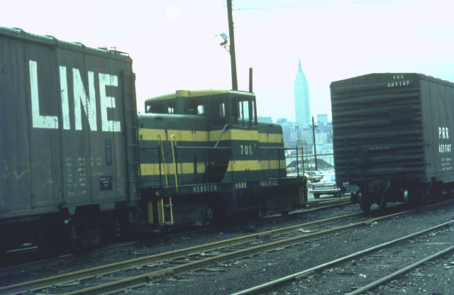 - Brand-new GE 44-ton HMRR 701 sits at the 14th Street enginehouse. (See Map A) Note the Empire State Building at extreme right. This unit, and companion 44-tonner 700, later survived to become Hoboken Shore 700 and 701.